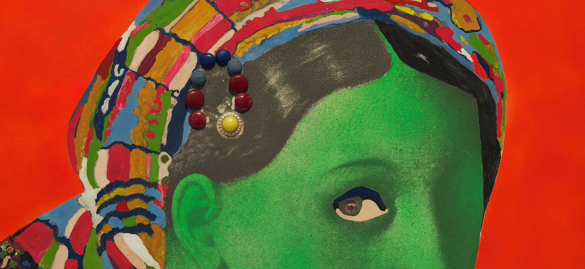 Un détail de la figure est ici photographié et agrandi. Repeint à l’aérosol, il est affublé pour cette composition d’objets de pacotille alors fabriqués au Japon.