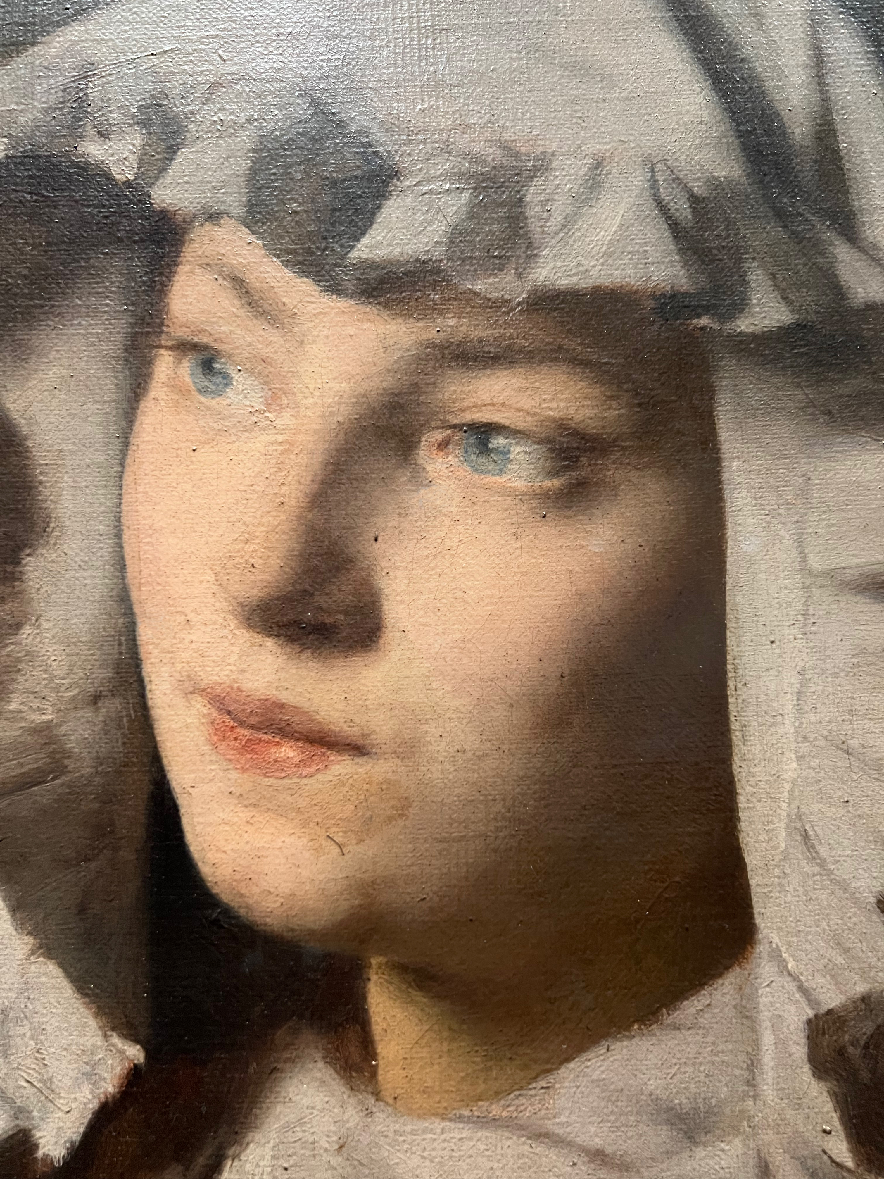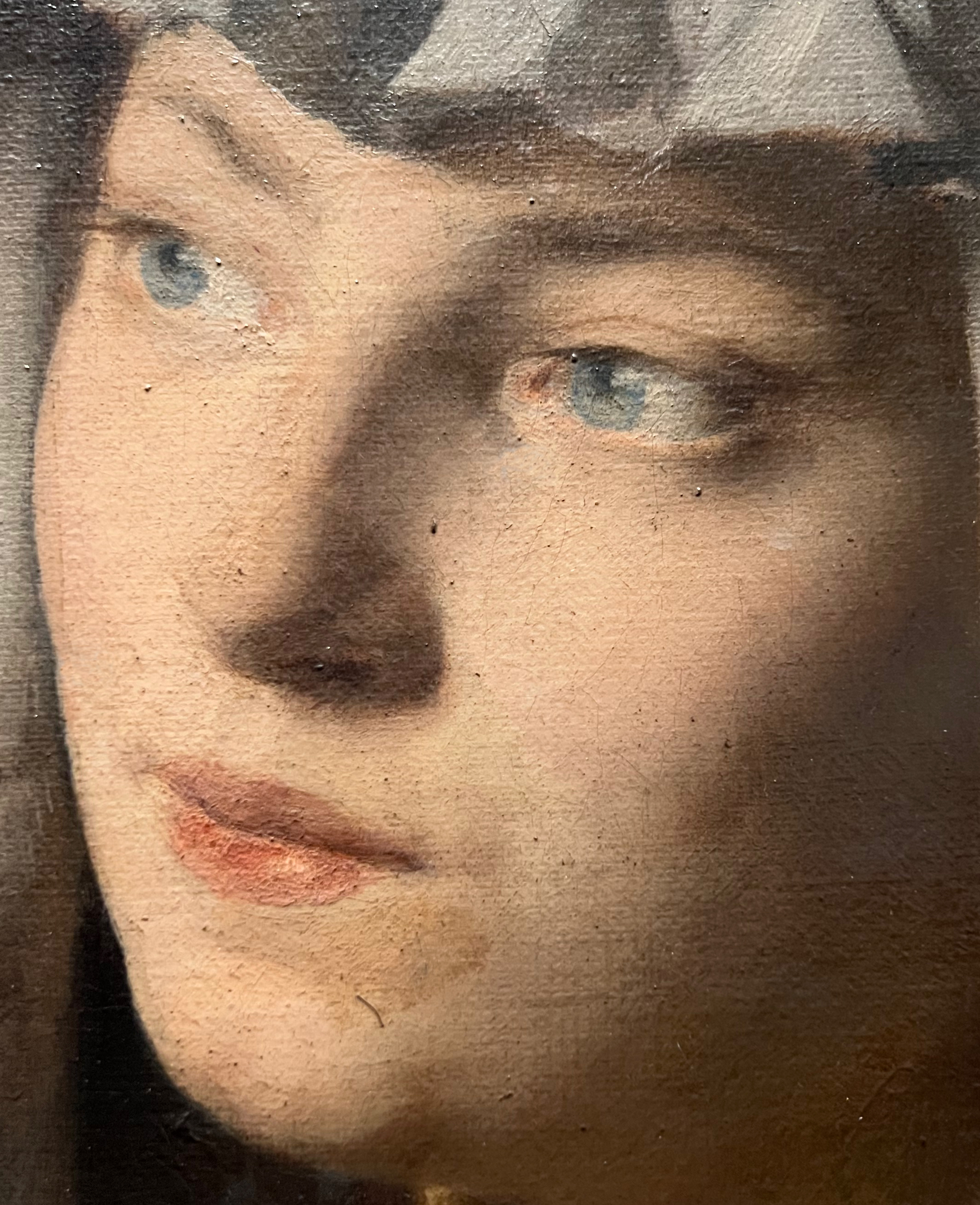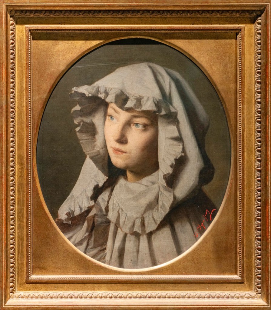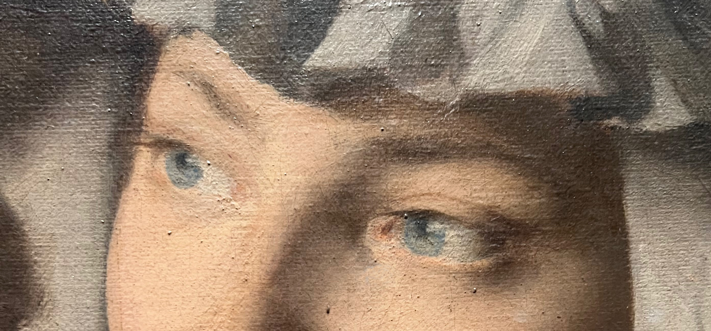 La biographie un peu triste d’Édouard Agneessens est tellement succincte que l’on ne sait rien du modèle de ce portrait. Aussi me faut-il imaginer les pensées cachées derrière ce regard bleu, sous le pinceau du peintre…