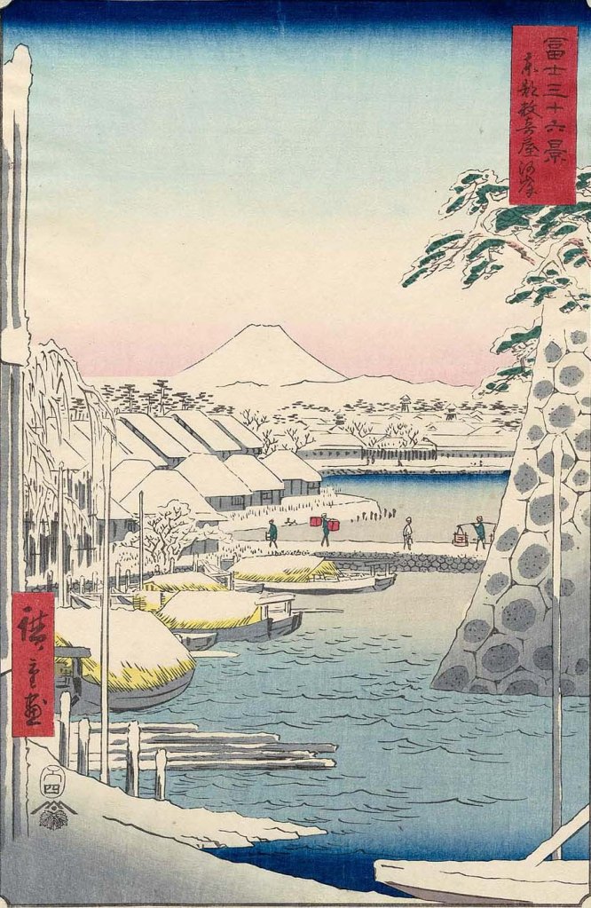 1 Riverbank at Sukiya in Edo, from the series Thirty-six Views of Mount Fuji , Utagawa Hiroshige I (1797–1858), Edo period, 1858, Woodblock print (nishiki-e); ink and color on paper, 37.1 × 25.3 cm, MFA Boston