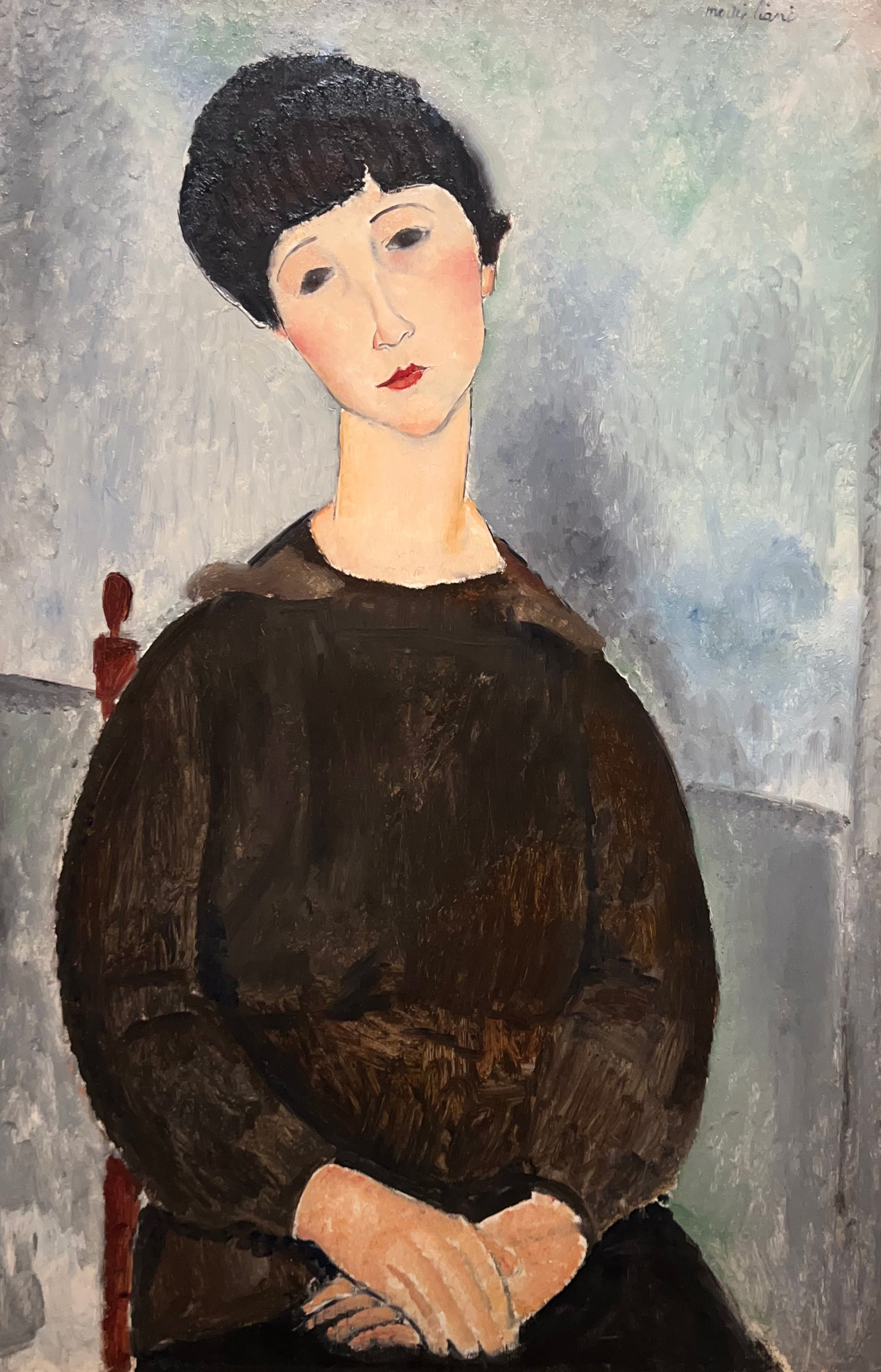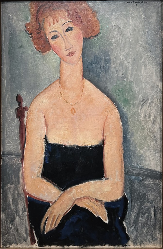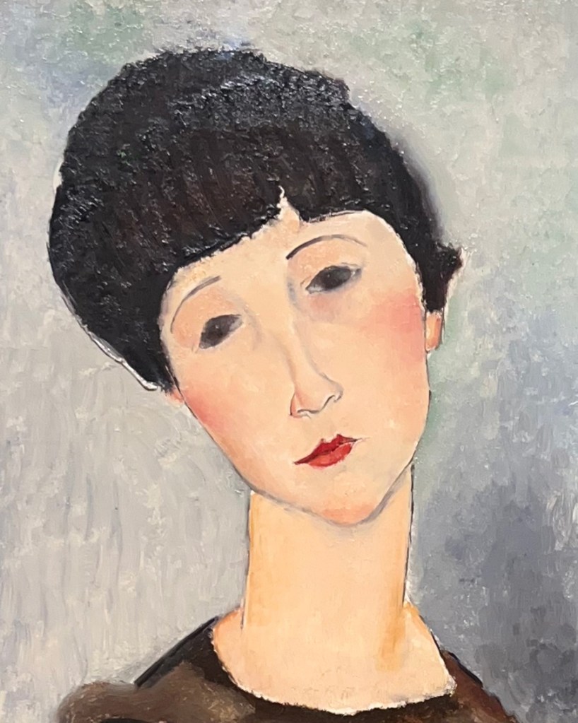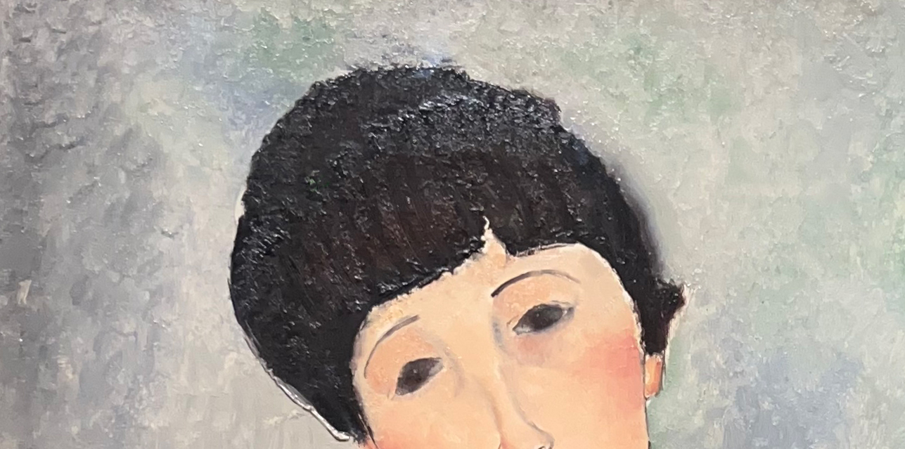 J’ai pu admirer longuement ce visage, ces yeux en amande sombres et profonds, cette tête inclinée au long cou accentué par des épaules tombantes dans la troisième et dernière salle de l’exposition Amedeo Modigliani. Un peintre et son marchand, (au musée de l’Orangerie jusqu’au 15 janvier 2024).