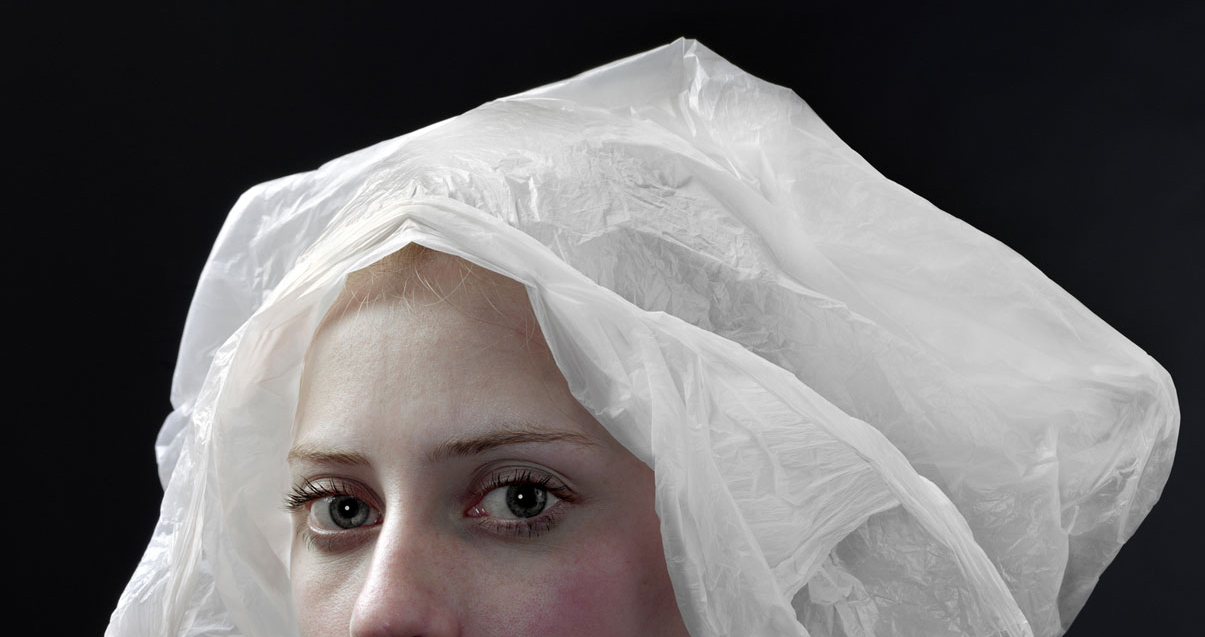 Dans Bag » un sac en plastique est façonné pour ressembler à une coiffe en dentelle.