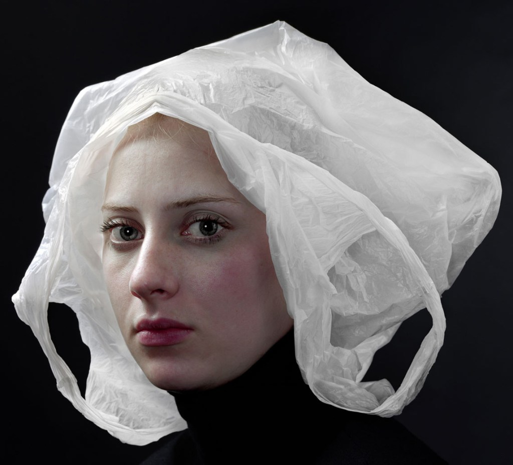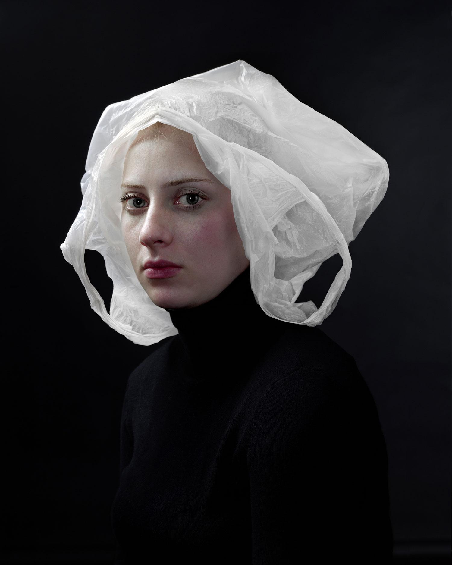 Le travail de Kerstens, cependant, ne se limite pas à l’imitation de la peinture. Dès le début, il s’est de plus en plus intéressé à combiner l’art du portrait photographique avec le jeu consistant à créer un dialogue (…) entre passé et présent. Un accessoire trivial – un morceau de papier d’aluminium, une serviette en papier, un sac en plastique – nous ramène dans le monde contemporain. Les titres révèlent le jeu.