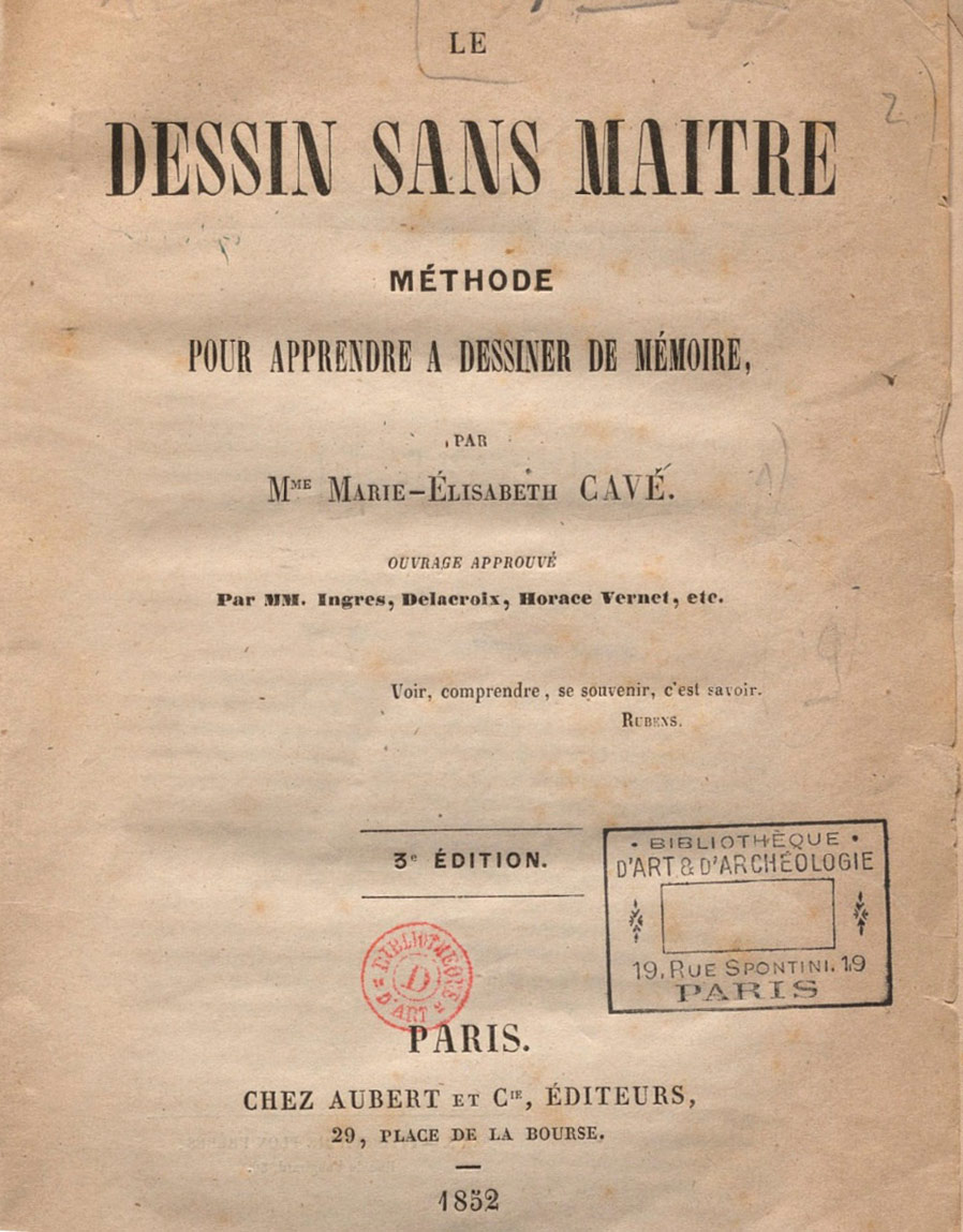 Pour élaborer sa technique d’apprentissage, Madame Cavé s’inspire d’exemples puisés chez ses prédécesseurs comme Leon Battista Alberti (1404-1472), Léonard de Vinci (1452-1519), Albrecht Dürer (1471-1528) ou Sebastiano Serlio (1475-1554?) mais également chez ses contemporains comme Horace Lecoq de Boisbaudran (1802-1897) ou Amaranthe Roulliet (1810-1888).