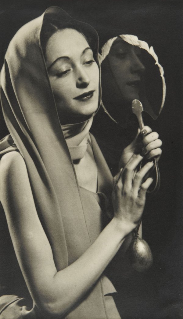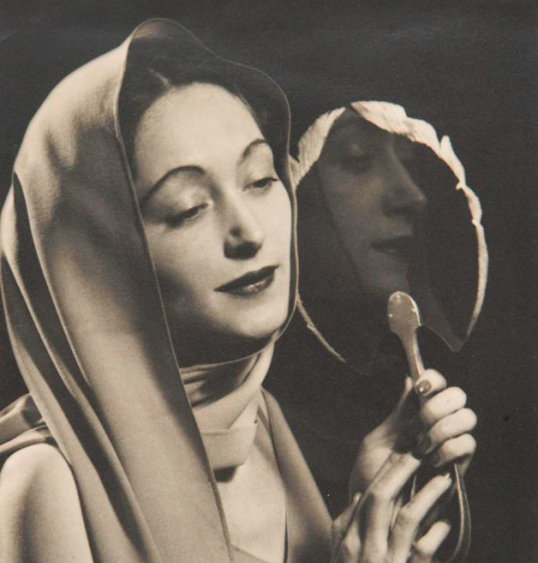 Sur cette photographie, Nusch Éluard tenait un éventail Schiaparelli étincelant en « verre » fabriqué en Rhodophane, un tissu de cellophane ; un petit étui de maquillage en forme d’œuf doré pendait à son poignet gauche.
