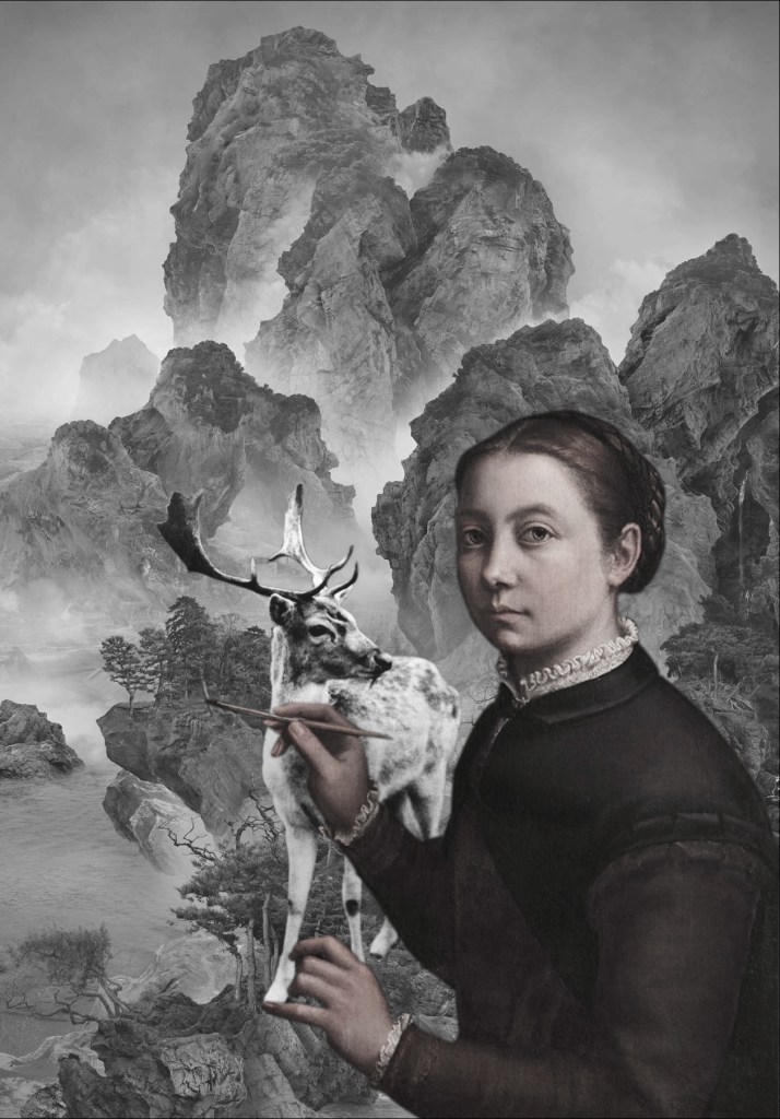 Dans l’un des collages de ma série fragments d’elles, j’ai imaginé Sofonisba voyageant plus loin encore, invitée en résidence à la cour de l’empereur chinois Jiajing (1507-1567), de la dynastie des Ming, accompagnée d’un cervidé, symbole de longévité…
