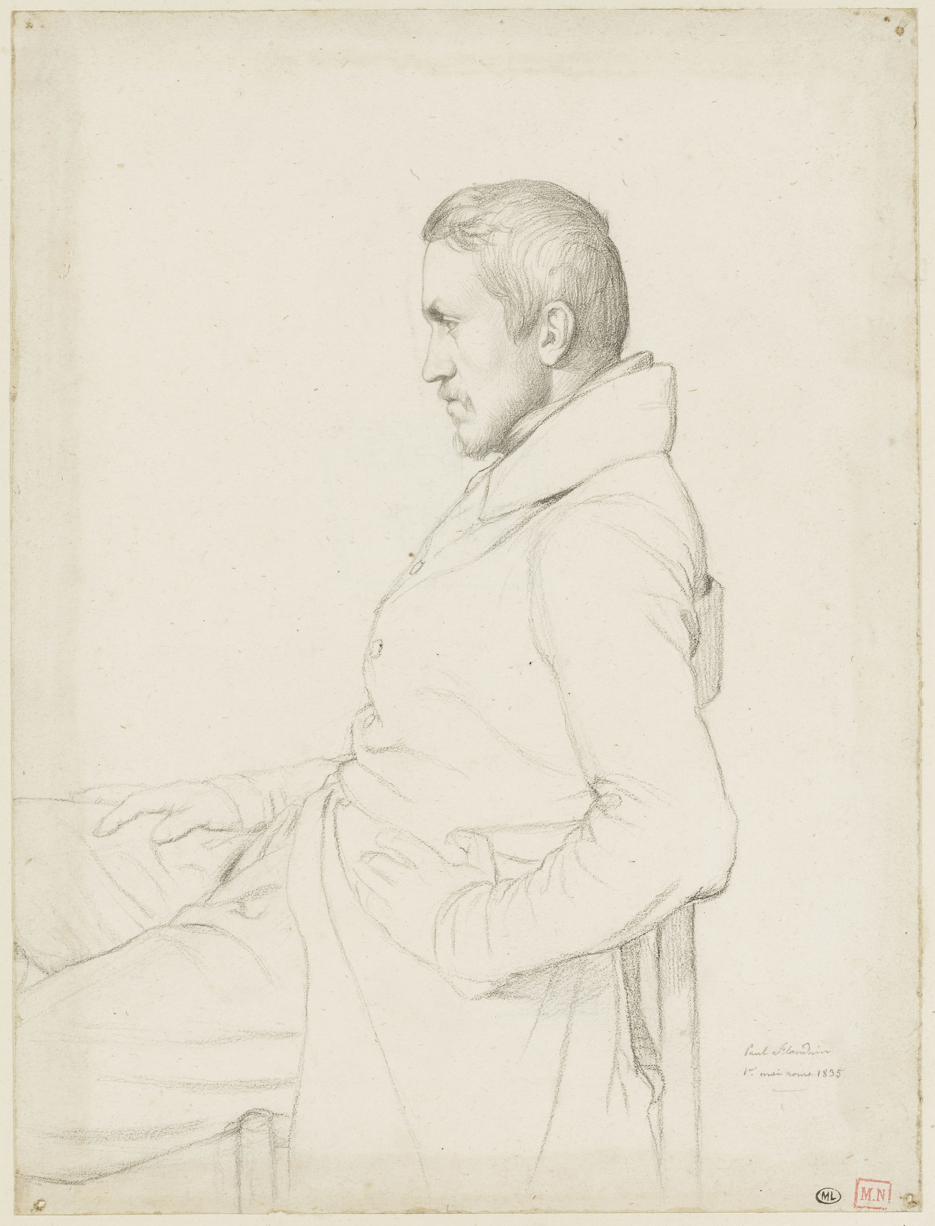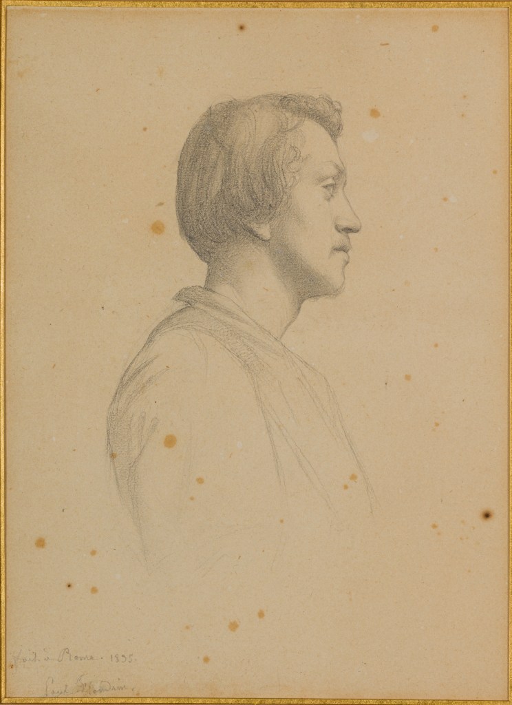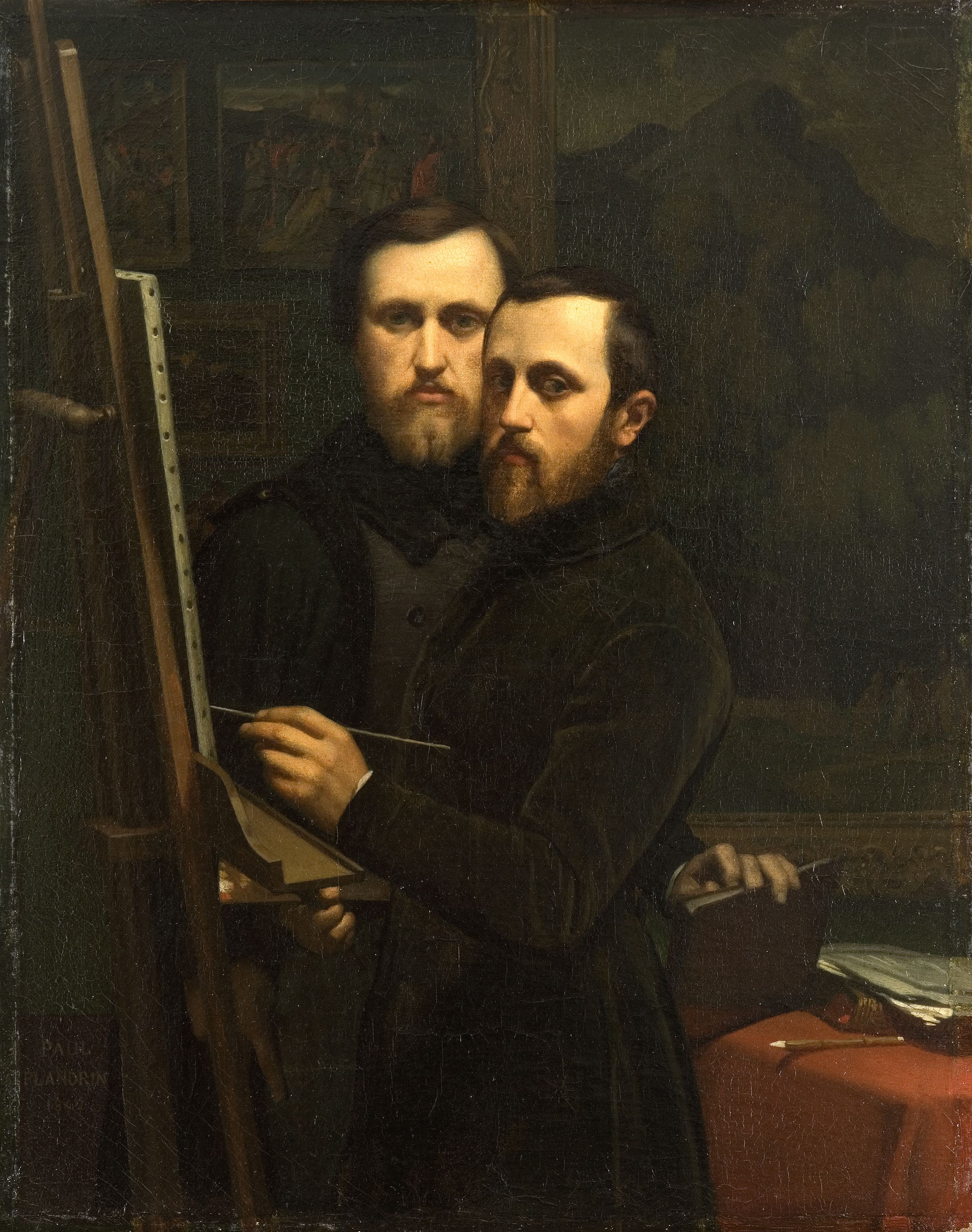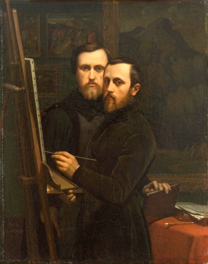 En 1842, Hippolyte et Paul partagent un atelier à Paris. C’est là qu’ils se représentent dans ce double portrait peint du musée d’Arts de Nantes. À l’inverse du dessin du Louvre, Paul est debout au premier plan en train de peindre à son chevalet, tandis qu’Hippolyte, un livre à la main se tient de face, en retrait. À l’arrière plan sont accrochées les œuvres de Paul, des paysages et deux répliques d’œuvres de son frère.