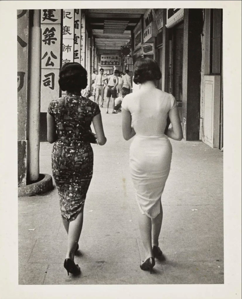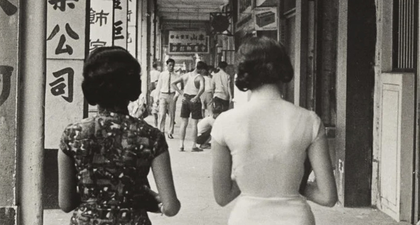J’invente, j’imagine, je décide que ces deux hongkongaises aux coiffures jumelles, sanglées dans leurs robes qipao 旗袍, en cadence miroir sur leurs talons aiguille, et photographiées malicieusement dans une rue du Hong Kong des années 60 du XXe siècle par Yau Leung sont des sœurs. La position de leurs bras indique qu’elles tiennent quelque chose à deux mains : une pochette assortie à leurs chaussures, un gâteau de lune 月饼, mystère…
