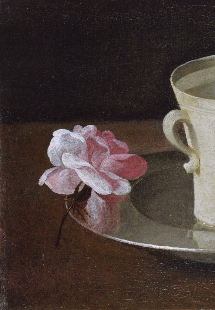 1 Une tasse d’eau et une rose, détail, vers 1630, Francisco de Zurbarán (1598-1664) huile sur toile, 21,2 x 30,1 cm, Londres, The National Gallery.