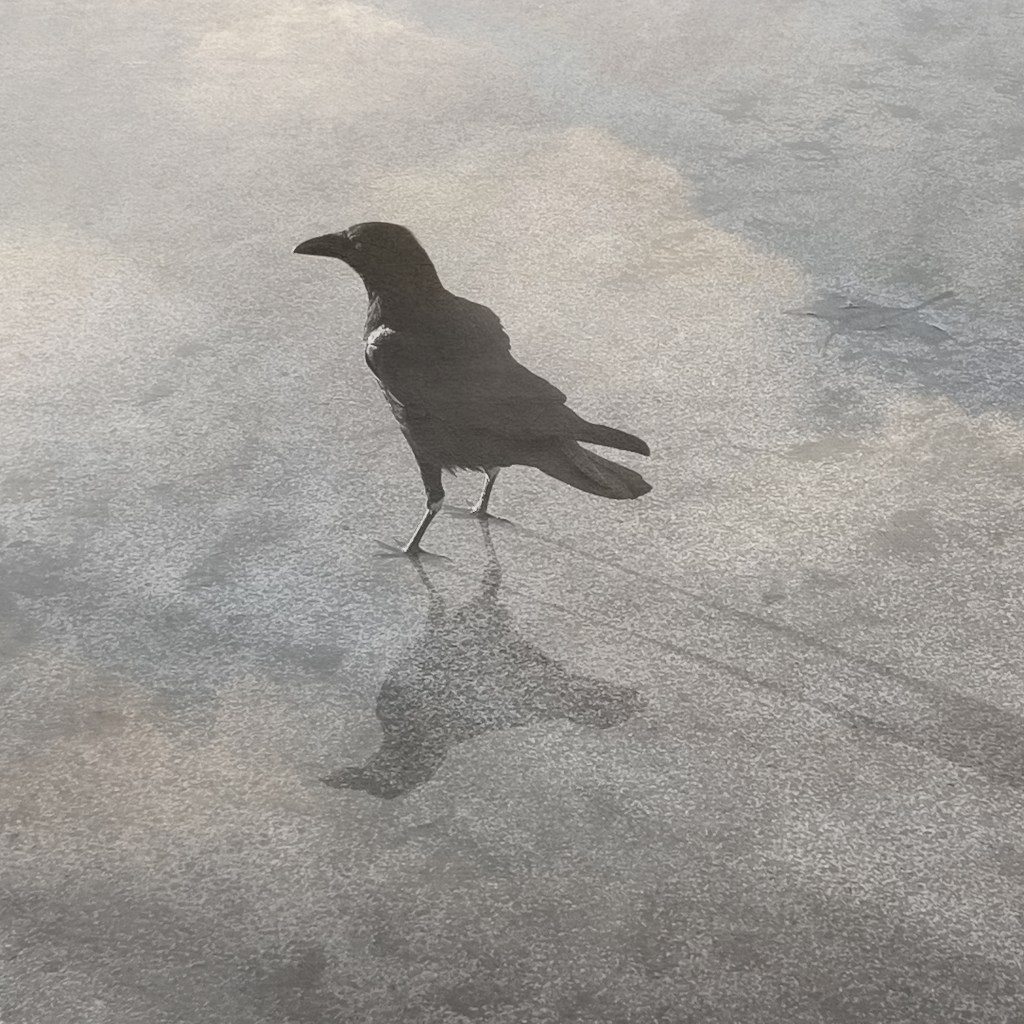 Deux ombres portées de cette corneille surveillant ce matin le flot des passants le long du miroir d’eau où se reflètent les nuages.