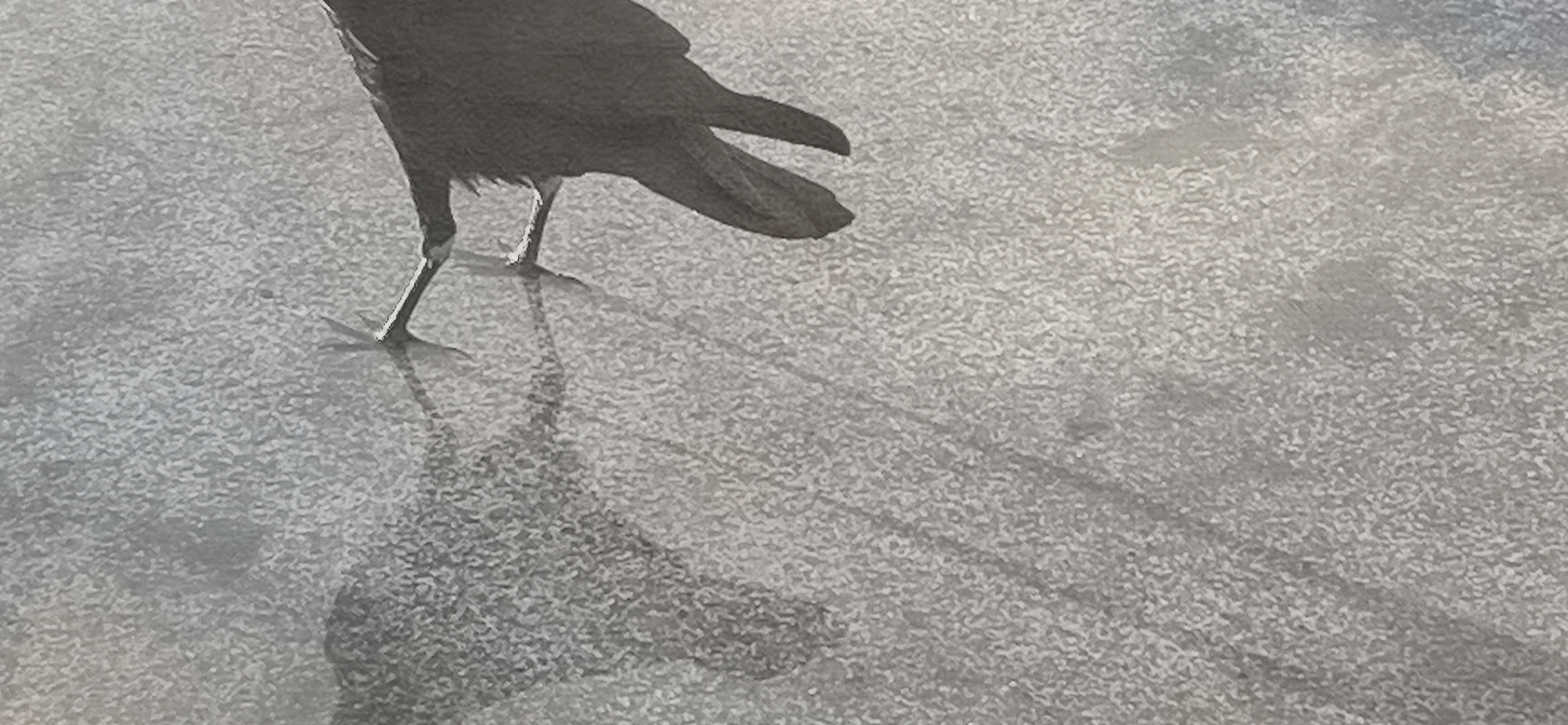 Deux ombres portées de cette corneille surveillant ce matin le flot des passants le long du miroir d’eau où se reflètent les nuages.