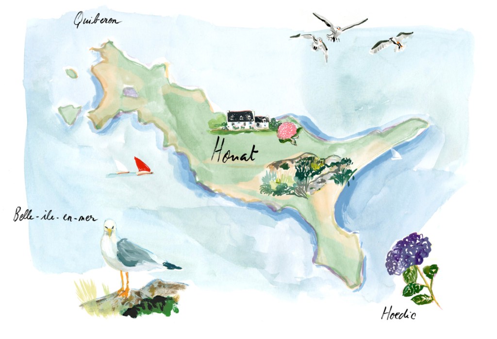 Grand été, Houat. Si belle qu’on ne sait par quelle échancrure l’aborder. Elle est protégée par d’énormes rochers. Masses granitiques de toutes dimensions, de toutes formes qui s’élèvent immobiles au milieu de l’agitation perpétuelle de l’Océan.